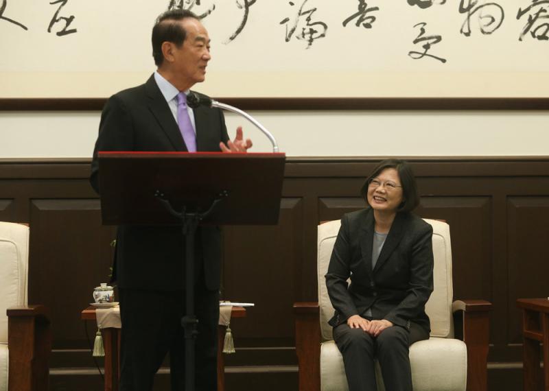圖:宋楚瑜(左)24日在台北向蔡英文報告出使APEC事宜。中央社