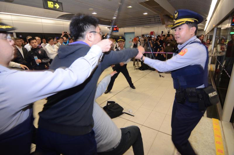桃園機場捷運通車在即,25日舉行災害模擬演練,模擬旅客在捷運內丟擲汽油彈縱火,挾持人質,最後被警員制服,過程超逼真。