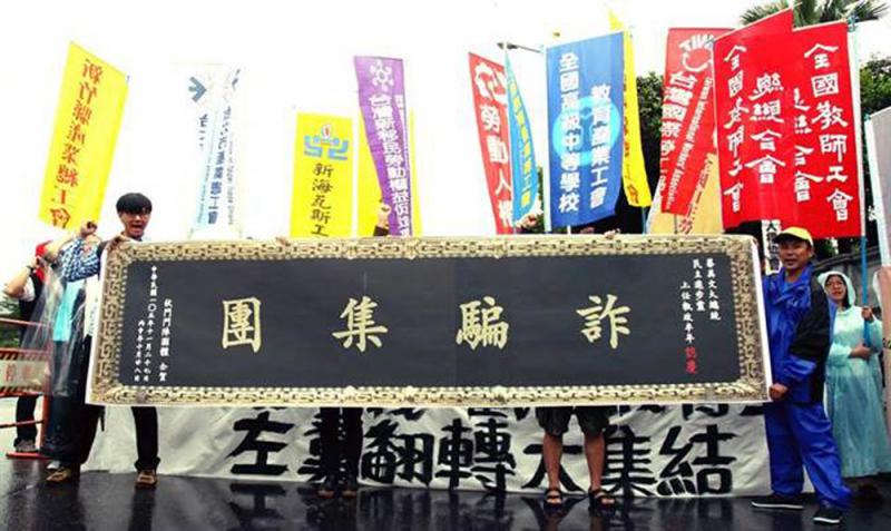 【大公報訊】據中通社報道:台灣地區2016「秋鬥」遊行27日登場,54個鬥陣團體在民進黨黨部前集結遊行,訴求「人民要正義、戳破假轉型」,現場還將寫有「詐騙集團」的匾額送給蔡英文。