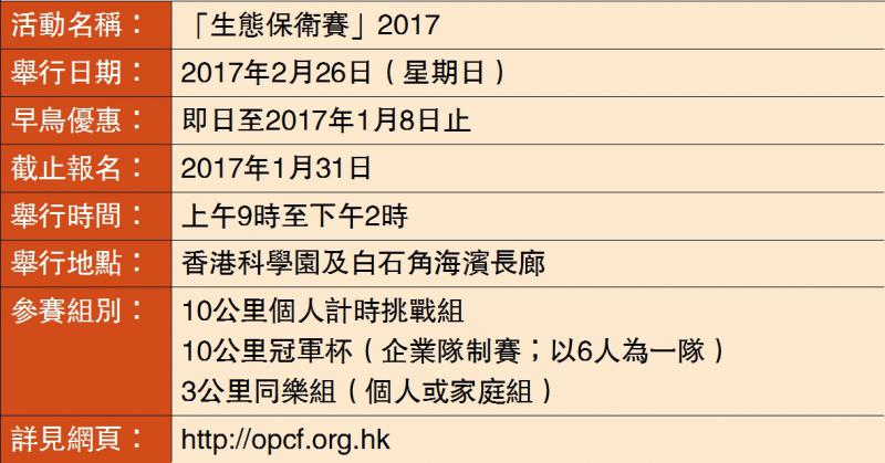 香港海洋公園保育基金「生態保衛賽2017」慈善跑展開,慈善跑旨在讓公眾明白海洋垃圾問題已迫在眉睫,嚴重危害海洋生物。今屆活動定於2017年2月26日在香港科學園舉行,參加者將可體驗海洋動物如何掙扎求存,齊心挑戰各種各樣造成污染的「海洋殺手」。慈善跑即日起接受報名,截止日期為2017年1月31日,有意參加者請於http://www.opcf.org.hk登記。