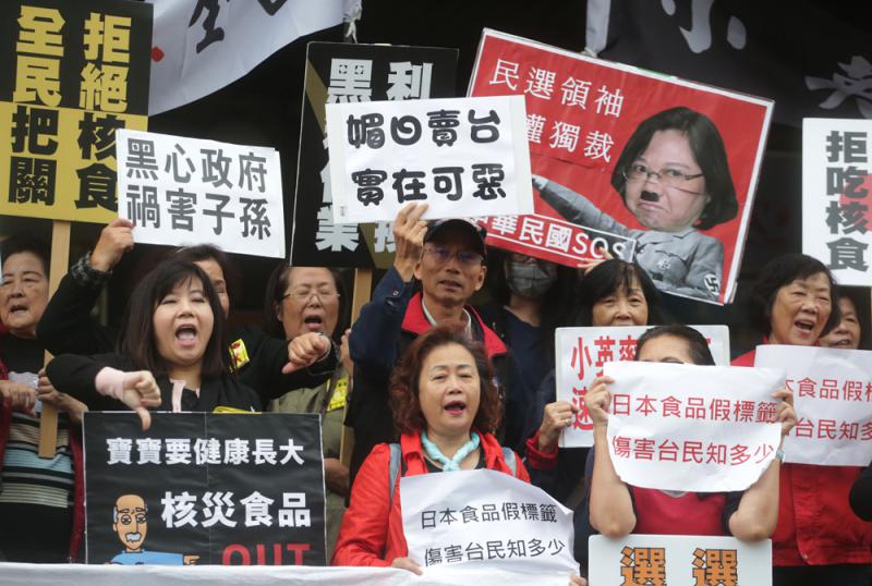 圖:國民黨青年部一日前往「行政院」公聽會預備會議現場,抗議民進黨當局擬進口日本核災區食品\中央社