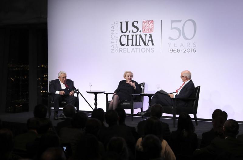 圖:美國前國務卿基辛格(左)和奧爾布賴特(中)五日在紐約出席名為「領袖對話:國務卿論壇」的活動/新華社