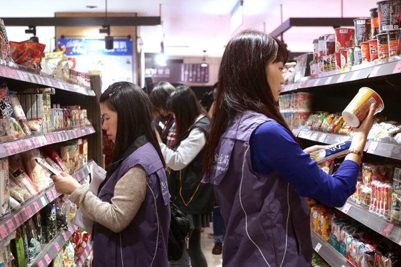 圖:島內食藥署及北市府衛生局人員十二日赴台北新光三越百貨的超市,針對日本泡麵、納豆等食品進行標示查核/中央社