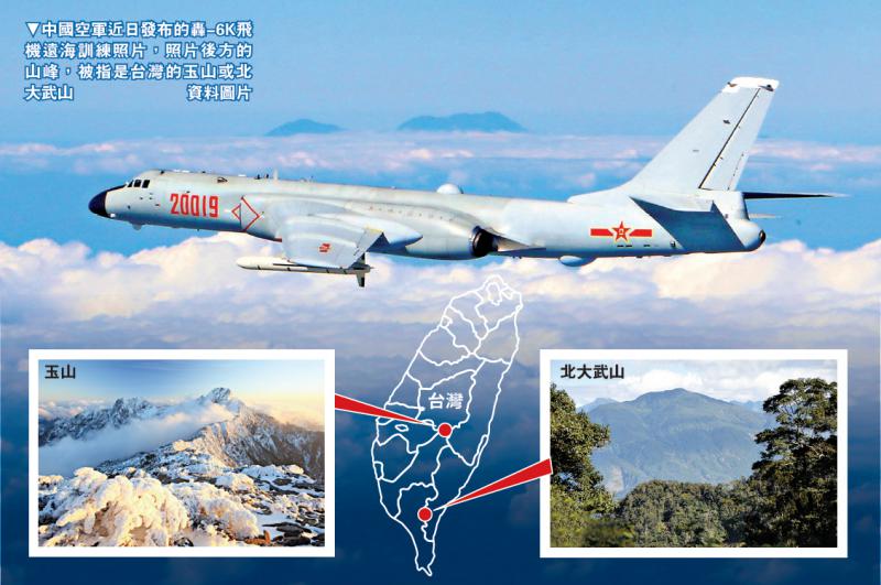 圖:中國空軍近日發布的轟-6K飛機遠海訓練照片,照片後方的山峰,被指是台灣的玉山或北大武山/資料圖片