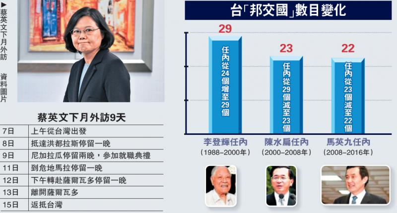 島內「外交部」政務次長侯清山當天介紹,蔡英文明年1月出訪中美洲的名稱為「英捷專案」,行程共9天8夜,隨行人員約90餘人,1月7日出發,預計15日返台。