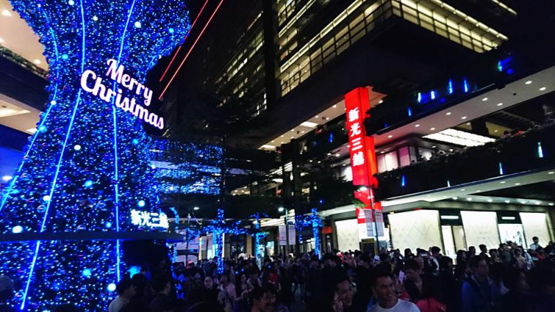 圖:台北25日天氣溫暖,信義商圈晚間擠滿歡慶佳節的人群 中央社