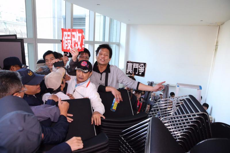 圖:12月31日,台北舉行首場年金改革座談會,有抗議民眾衝進會議中心/中央社