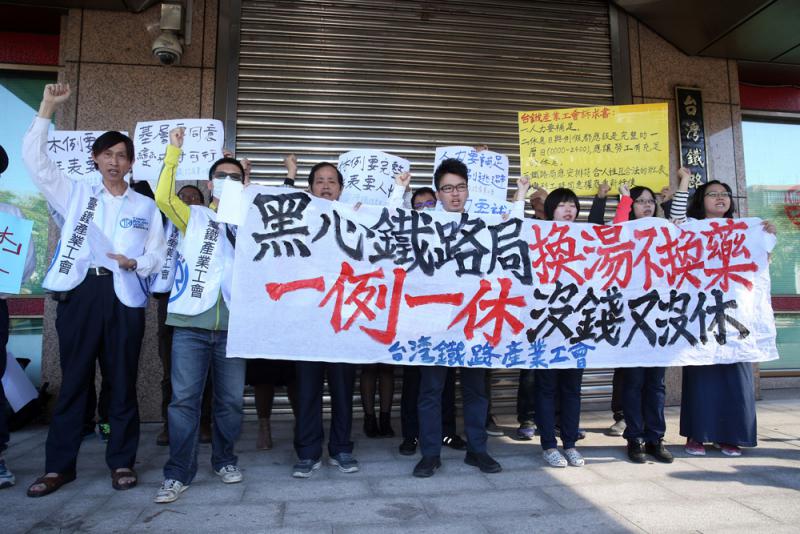 圖:台鐵產業工會近日在台北車站舉行記者會,批評當局推動的「一例一休」政策令勞工「沒錢又沒休」 中央社