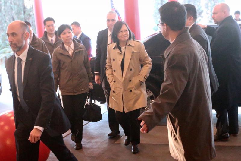 圖:蔡英文七日(當地時間)過境美國休斯頓。圖為她在結束參訪行程後,返回下榻的飯店/中央社