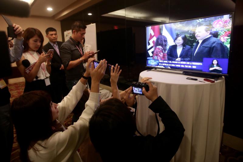 【大公報訊】綜合中央社、中評社及中通社報道:蔡英文於1月7日啟程出訪中美洲的洪都拉斯、尼加拉瓜、危地馬拉和薩爾瓦多4國。並於1月9日,結束洪都拉斯訪問,搭乘專機飛往尼加拉瓜。於當地時間下午4時45分抵達尼國,隨團的台灣媒體關注尼國總統奧蒂嘉是否會與蔡英文見面,因為根據蔡英文出訪的行程表,完全看不到相關行程內容,而有關部門面對追問亦一直未有提供準確信息。直到傍晚,隨行記者被帶到下榻的飯店媒體中心時,卻有記者經過媒體中心電視前驚呼,「蔡英文在接見奧蒂嘉!」原來當地電視台正直播蔡英文和奧蒂嘉的會面實況,於是乎隨團記者趕緊蜂擁到電視機前拍照、錄音,一片忙亂。