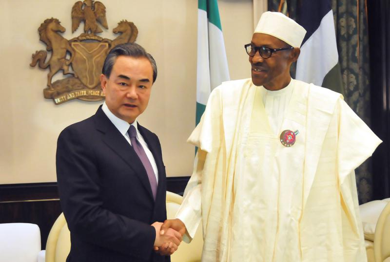 圖:尼日利亞總統布哈里(右)十一日在阿布賈總統府會見中國外交部長王毅/新華社