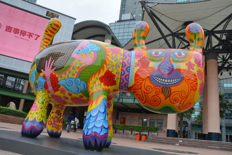 台灣藝術家洪易所創作的裝置藝術展在新北市府市民廣場展出。「招財貓」身上藍色的筋斗雲,顯現輕盈靈巧的身軀。\中央社