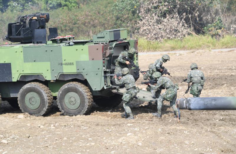 圖:台軍春節加強戰備,17日由陸軍在台中的天山教練場操演。圖為戰鬥人員演練從雲豹裝甲車而出,與敵軍交火/資料圖片
