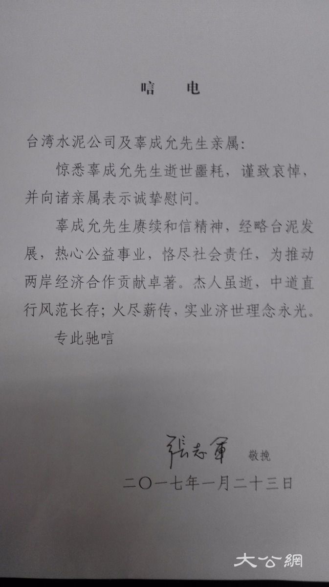 中共中央台辦、國務院台辦主任張志軍向台灣水泥公司及辜成允先生親屬發唁電表達慰問。