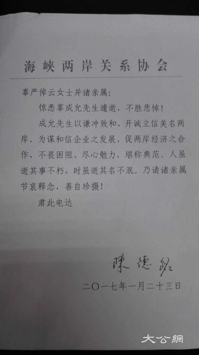 陳德銘在唁電中說,成允先生以謙沖致和、開誠立信美名兩岸。為謀和信企業發展、促兩岸經濟之合作,不畏困阻、盡力勉力,堪稱典範。人雖逝其事不朽,時雖逝其名不泯。乃請諸親屬節哀釋念,善自珍攝!