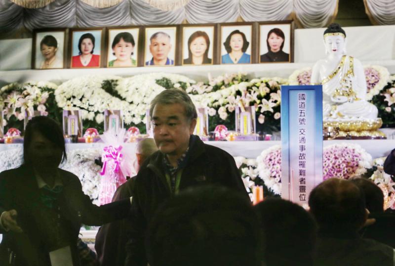 圖:台旅巴翻側事故罹難者「頭七法會」18日晚在台北第二殯儀館舉行,涉事的蝶戀花旅行社創辦人周比蒼(右)抵達靈堂,全程不發一語/中央社