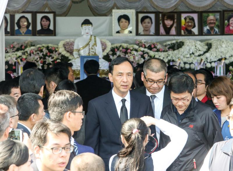 圖:新北市長朱立倫(中)十九日到台北第二殯儀館出席「交通事故罹難者追悼會」致哀/中央社
