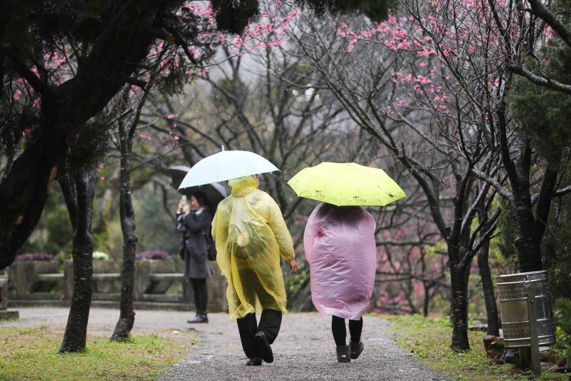 台灣二二八連假雖然有冷氣團攪局,但民眾仍前往陽明山,在濕冷天氣中體驗櫻花之美。 中央社
