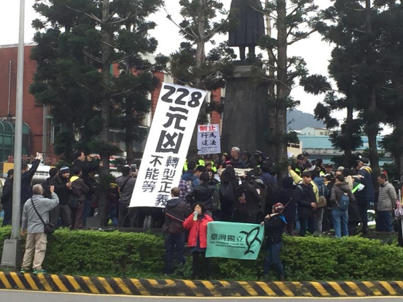 「台獨」人士、「自由台灣黨」創黨主席蔡丁貴27日率眾在基隆火車站前,發起「228元兇轉型正義不能等」活動,佔據馬路,一度企圖將舊火車站前蔣介石銅像拉倒。在行動過程中,蔡丁貴等人與警方爆發肢體衝突。警員流血受傷,抗議民眾則因激動昏倒送醫。事件令行經火車站周邊的車輛被阻擋,交通大亂。國民黨文傳會批評蔡英文當局,持續製造對立、藉「去蔣化」來掩飾執政無能,撕裂台灣的行為十分不可取。