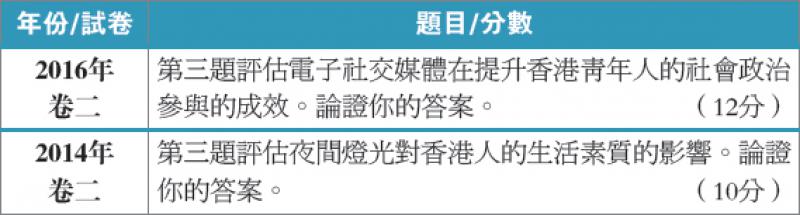 通識題型有不少,如比較題型、建議題型、如何題型等。近年,評估題型在通識卷二出現,分別在2014年及2016年,內容詳見圖表:
