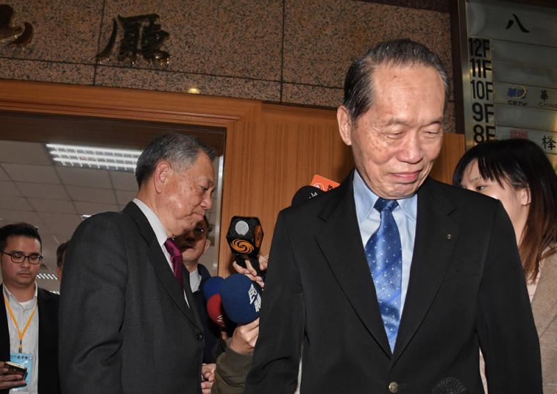 圖:國民黨副主席陳鎮湘(前右)1日在國民黨中常會後,在會場外向前來報告「319」槍擊案的前副主席詹啟賢(左二)致意,兩人短暫握手寒暄後,各自離去/中央社