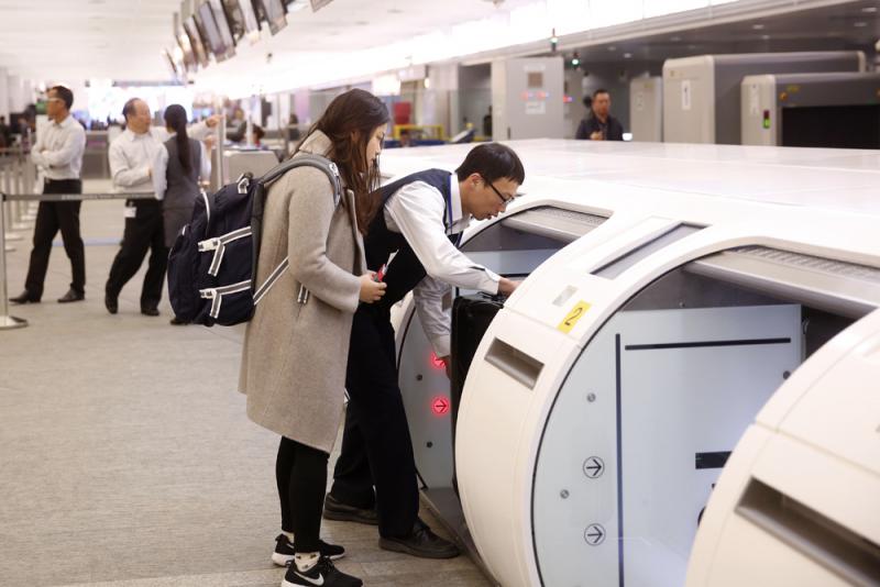 圖:桃園機場捷運正式營運,乘客在台北車站提前辦理託運行李\中新社