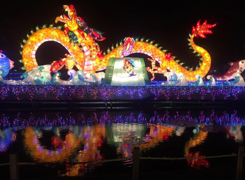 苗栗白沙屯拱天宮媽祖徒步進香活動二日到達雲林北港。圖為北港水道頭燈區「魚躍龍門」延長展期,邀民眾賞燈。\中央社