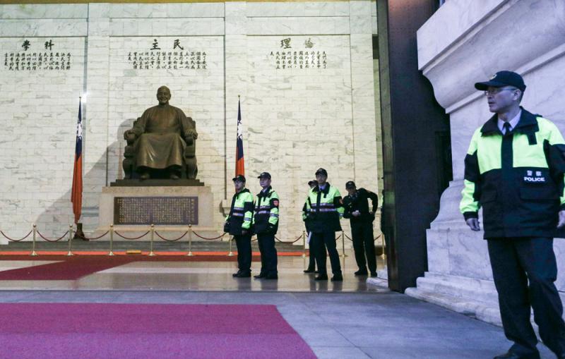 圖:上月「二二八」期間,島內一些蔣介石銅像遭破壞。警方在台北市中正紀念堂加強保安\資料圖片