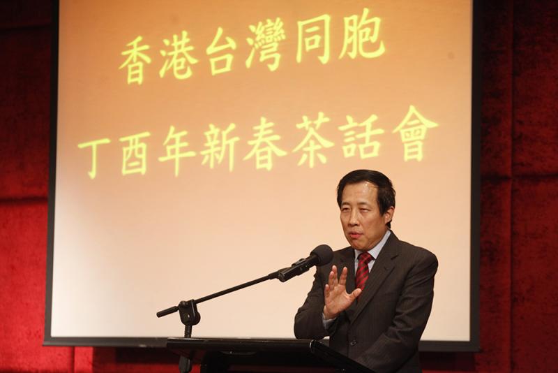圖:中聯辦副主任楊建平十三日在「香港台灣同胞丁酉年新春茶話會」上致辭 大公報攝