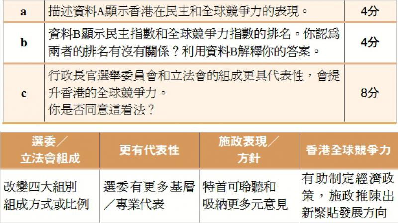 再就分題b作分析,本題也屬數據題,筆者估計本來是想考問「有何關係」,但題目用上「你認為兩者的排名有沒有關係」的提問方式,無形中就有「有關係」和「沒有關係」兩種立場可供選擇,題目就自然變成了評論題。然而,題目只有4分,實在強考生所難。再者,數表中所列國家一半在全球民主和全球競爭力皆同樣是高或低排名,屬同步或正向關係,但另一半國家則是排名一高一低,屬不同步或逆向關係,考生根本難以作出有效和有意義的評論。面對這種題目本身就有「問題」的問題,筆者會化繁為簡,以安全的吹水式作答法應對,只簡單回答有關係,然後描述數字展示的全球民主和全球競爭力關係,最後不必用駁論,將另一半視為特別情況,就算應付過去了。