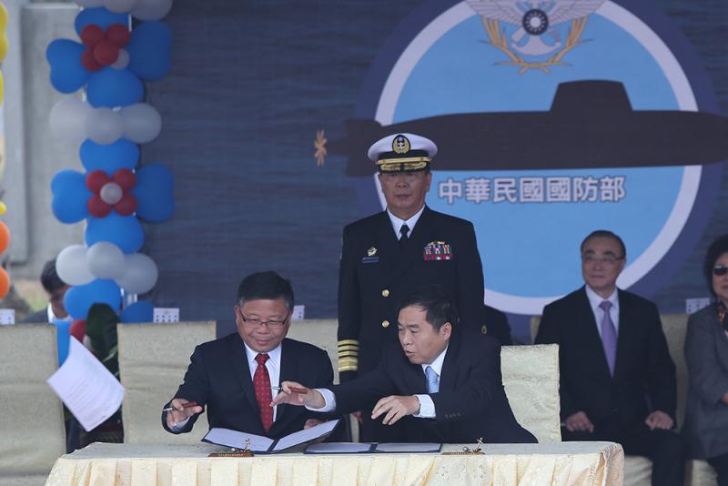 蔡英文21日南下高雄左營水星碼頭,參加「海軍2017年敦睦遠航訓練支隊啟航歡送暨潛艇自造設計啟動及合作備忘錄簽署儀式」。台防務部長馮世寬、海軍司令黃曙光、台船董事長鄭文隆以及中山科學研究院(「中科院」)院長張冠群,共同完成潛艇自造的啟動命令和簽署合作備忘錄。