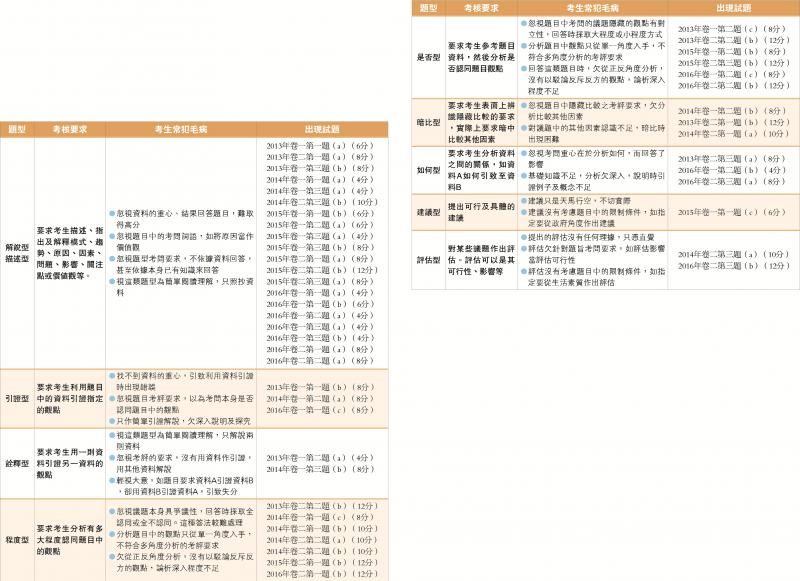 卷一資料回應題評估在於運用資料來回答題目中的議題。試題中的資料形式多元化,其中包括文字、漫畫、數據等。一些同學誤以為簡讀資料便可,實不明白資料回應的評估要求,要深讀深究才可。概念方面,一些同學的概念化能力稍遜,往往只有表面化解釋或描述,缺欠深入探究。解讀方面,一些同學未能理解題目所提供的資料,從中選取合用的部分加以分析,只盲目抄錄資料,未有詮釋資料傳遞的信息。分析方面,一些同學分析議題時較為狹窄,未能用宏觀多角度去探究,不配合本科的考評要求。