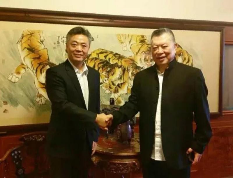 圖:北京市台辦主任王力軍(左)與洪門五聖山總山主劉會進合影留念\網絡圖片