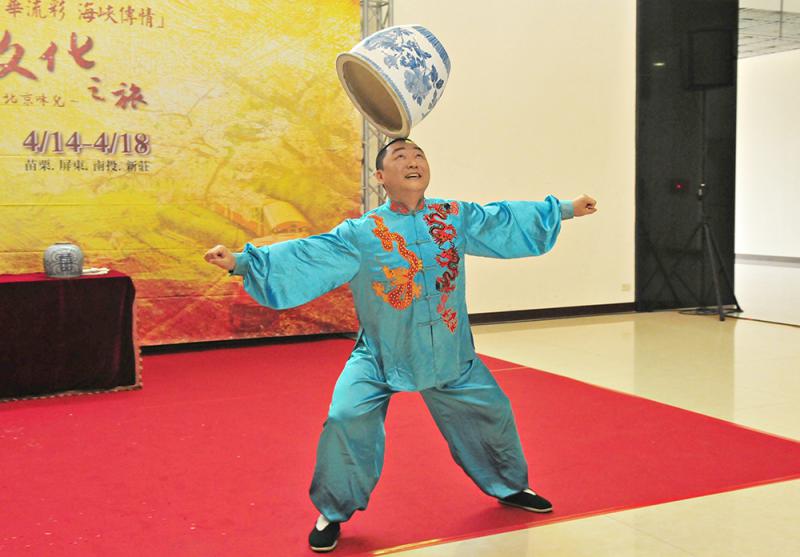 第17屆「京味文化之旅」14日將在苗栗縣苗北藝文中心演出,13日在縣府大廳暖身宣傳,讓全場驚呼連連。 中央社