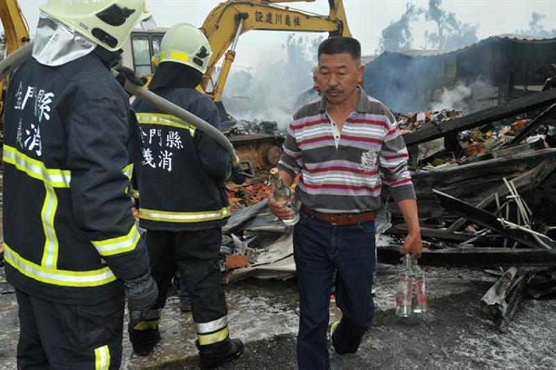 鐵皮倉庫在熊熊大火吞噬下,不時傳出高粱酒爆裂聲響,現場還瀰漫催人欲醉的酒香,讓圍觀民眾感嘆高粱酒真的變「燒酒」,毀於一場大火,實在太可惜了。