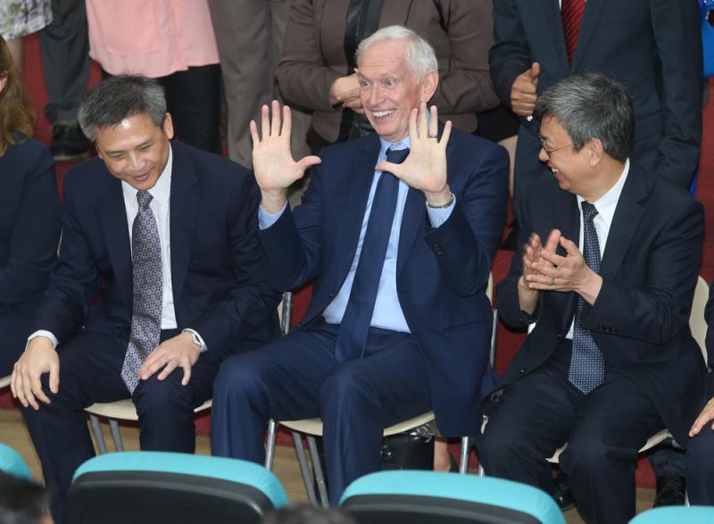 圖:美國在台協會主席莫健(中)25日在台灣出席活動\中央社