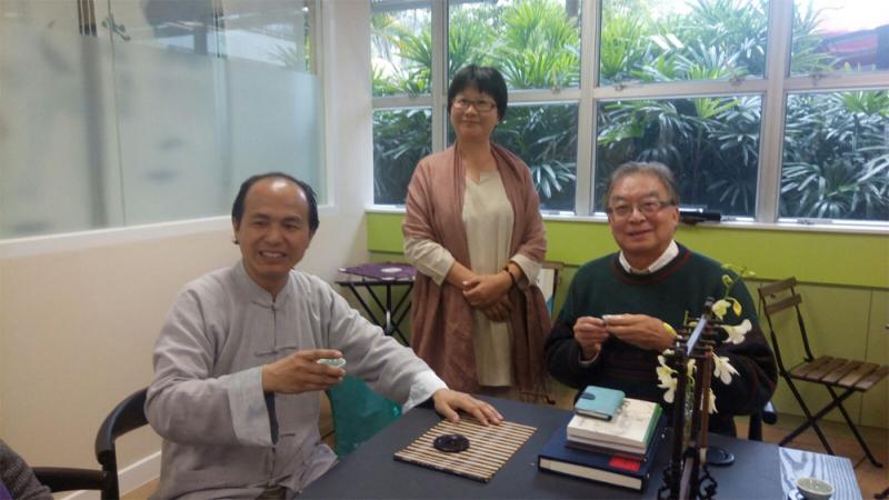 圖:賓主品茗。(左起)講者張衛東、語文中心代表邱小燕及蔣治中
