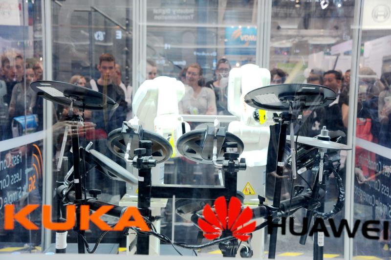 圖:2017德國漢諾威工業博覽會上,內地企業帶來大批智能製造領域的解決方案。圖為工業機器人以敲擊樂形式「演奏」流行歌曲《See You Again》,引來大批觀眾\中新社圖片