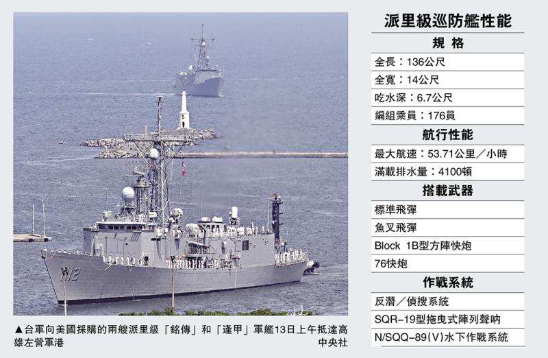 圖:台軍向美國採購的兩艘派里級「銘傳」和「逢甲」軍艦13日上午抵達高雄左營軍港/中央社