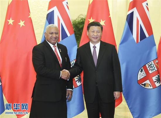 16日,斐濟總理姆拜尼馬拉馬出席「一帶一路」國際合作高峰論壇,並獲習近平主席會見,斐方表示願意堅持一個中國政策,希望同中國深化貿易、農業、基礎設施、人文領域交流合作,在全球性問題上密切配合。習近平也表示,斐濟是最早同新中國建交的太平洋島國,今後雙方要繼續在涉及各自核心利益和重大關切問題上相互支持。