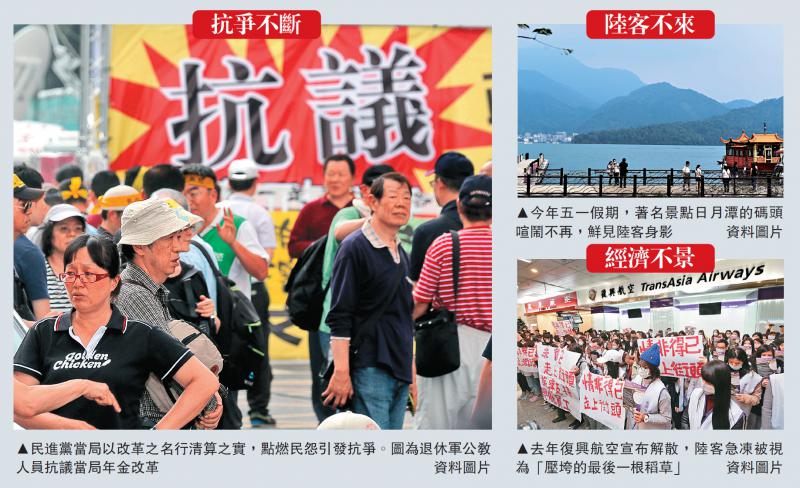 【大公報訊】民進黨當局執政即將屆滿一年,無論是拒不承認「九二共識」,破壞兩岸關係共同政治基礎,致使兩岸關係「急速冰凍」,衝擊台灣經濟;抑或拋出「轉型正義」、年金改革等議題引發社會對立,點燃民怨;即使外圍回溫,島內逾8成民眾稱經濟不好、薪資持續倒退;又或者在勞工食安等民生問題上施政無能、擾民不休,均引發社會怨聲載道,民望跌穿三成,抗爭活動頻繁。正如台旅遊業人士形容,過去一年是歷年經營最慘淡、最艱辛的一年。