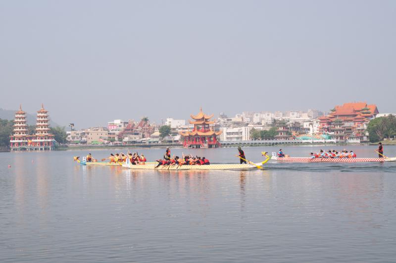 「2017高雄愛河端午龍舟錦標賽」27日登場,適逢南部旱象未解,有龍舟隊在高雄蓮池潭操舟備戰時,不忘祈雨。 中央社