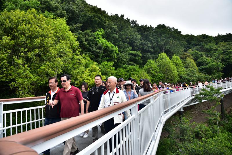 南投清境高空景觀步道27日啟用,台灣當局前領導人馬英九(左二)以及南投縣長林明溱(左一)為步道剪綵,體驗清境高空美景。 中央社