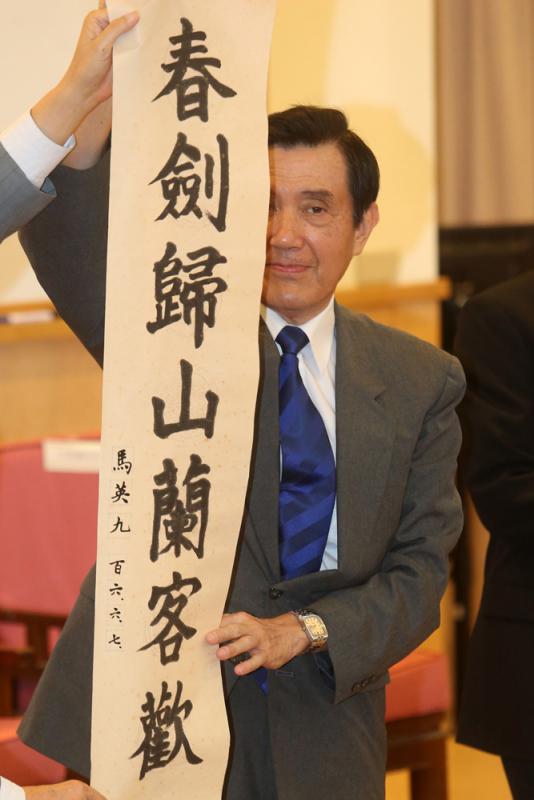 圖:馬英九在徵聯活動頒獎典禮上現場揮毫寫第一名的作品「春劍歸山蘭客歡」\中央社