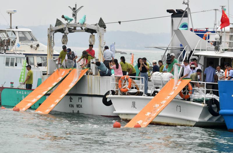 8日「世界海洋日」,金門、廈門兩地在金廈海域聯合放流366萬尾魚苗,以恢復漁業資源、保護廈金海域生態。 中新社