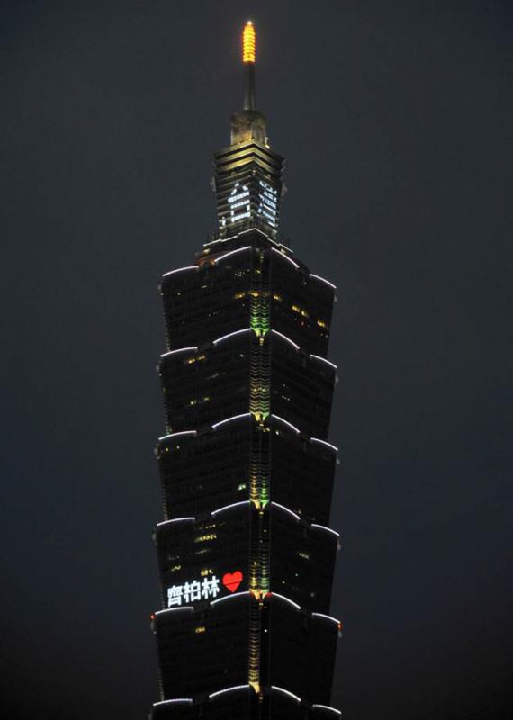 圖:台北101大樓11日晚間6時30分至10時在大樓點亮「看見台灣」及「齊柏林」字樣,悼念齊柏林 中央社
