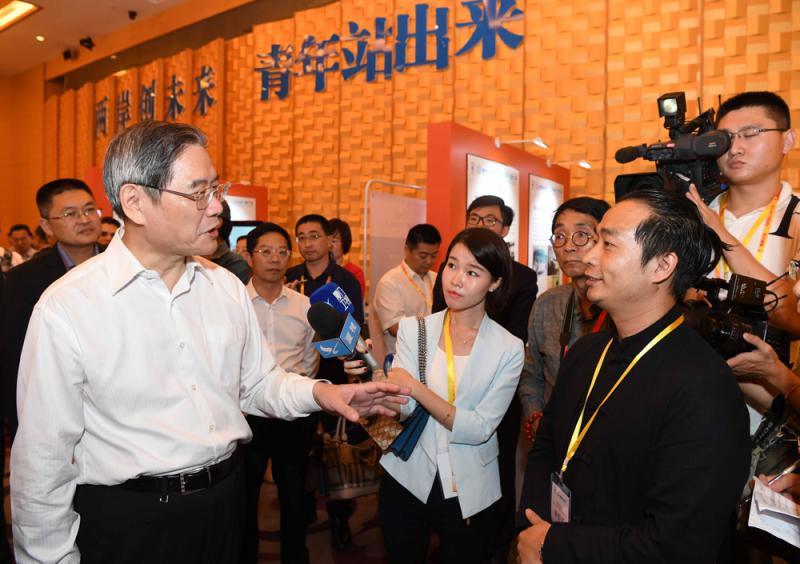 圖:張志軍來到「台灣青年來閩就業‧創業‧見習」對接會的現場和參展企業交流 中新社