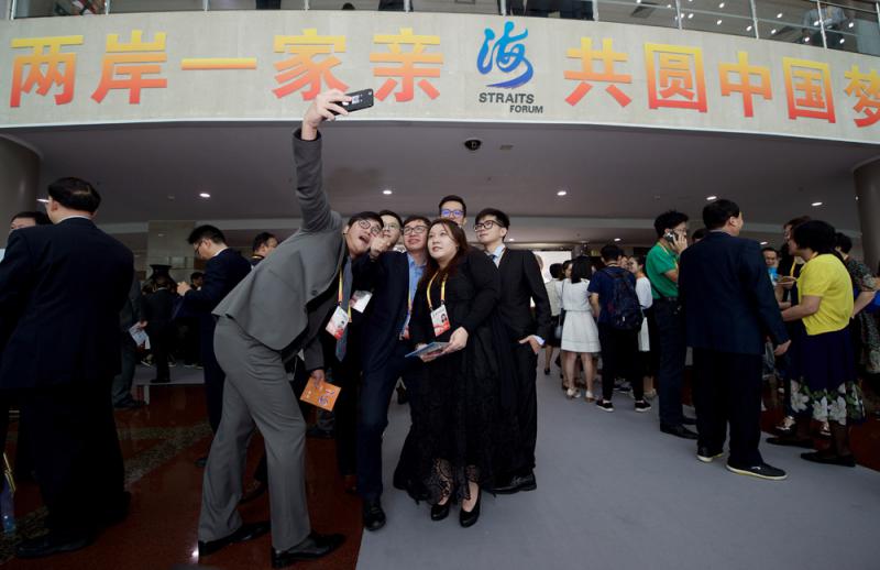 圖:幾位參加第九屆海峽論壇的台灣青年代表在論壇開始前合影留念 新華社