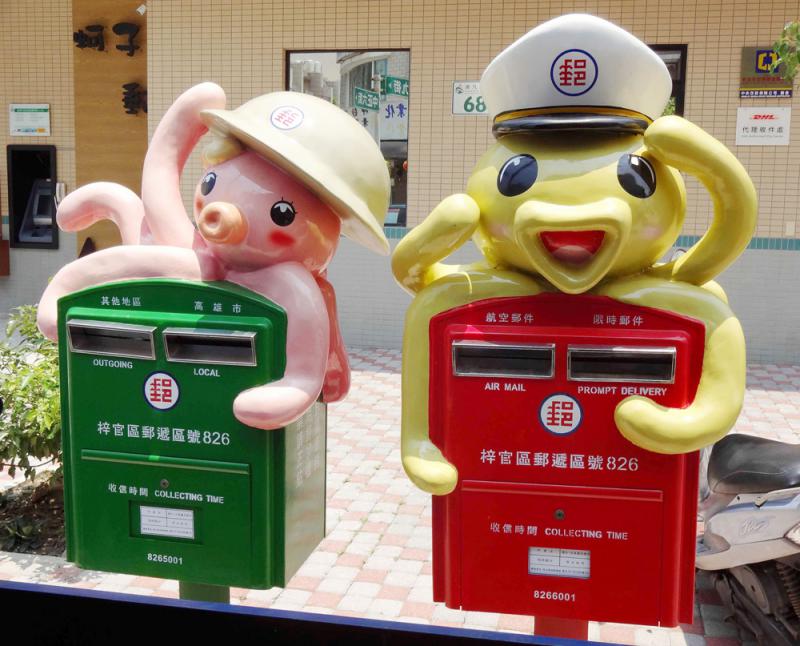 在高雄梓官區的蚵子寮郵局,因附近是觀光漁市場和漁港,郵局門前馬路旁設有可愛章魚造型的郵筒,鮮艷粉紅色和鵝黃色的兩隻章魚環抱着郵筒,遊客說「不想投信也難」。