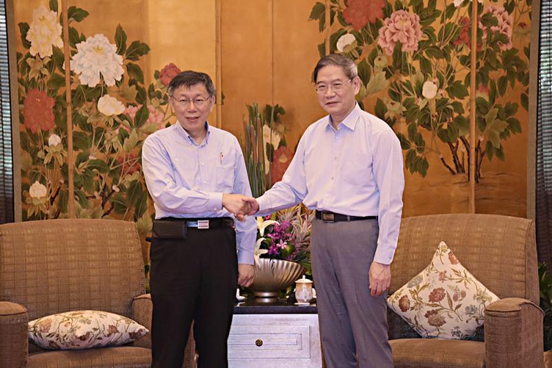圖:國台辦主任張志軍(右)三日下午在上海虹橋迎賓館與台北市長柯文哲(左)會面\中央社